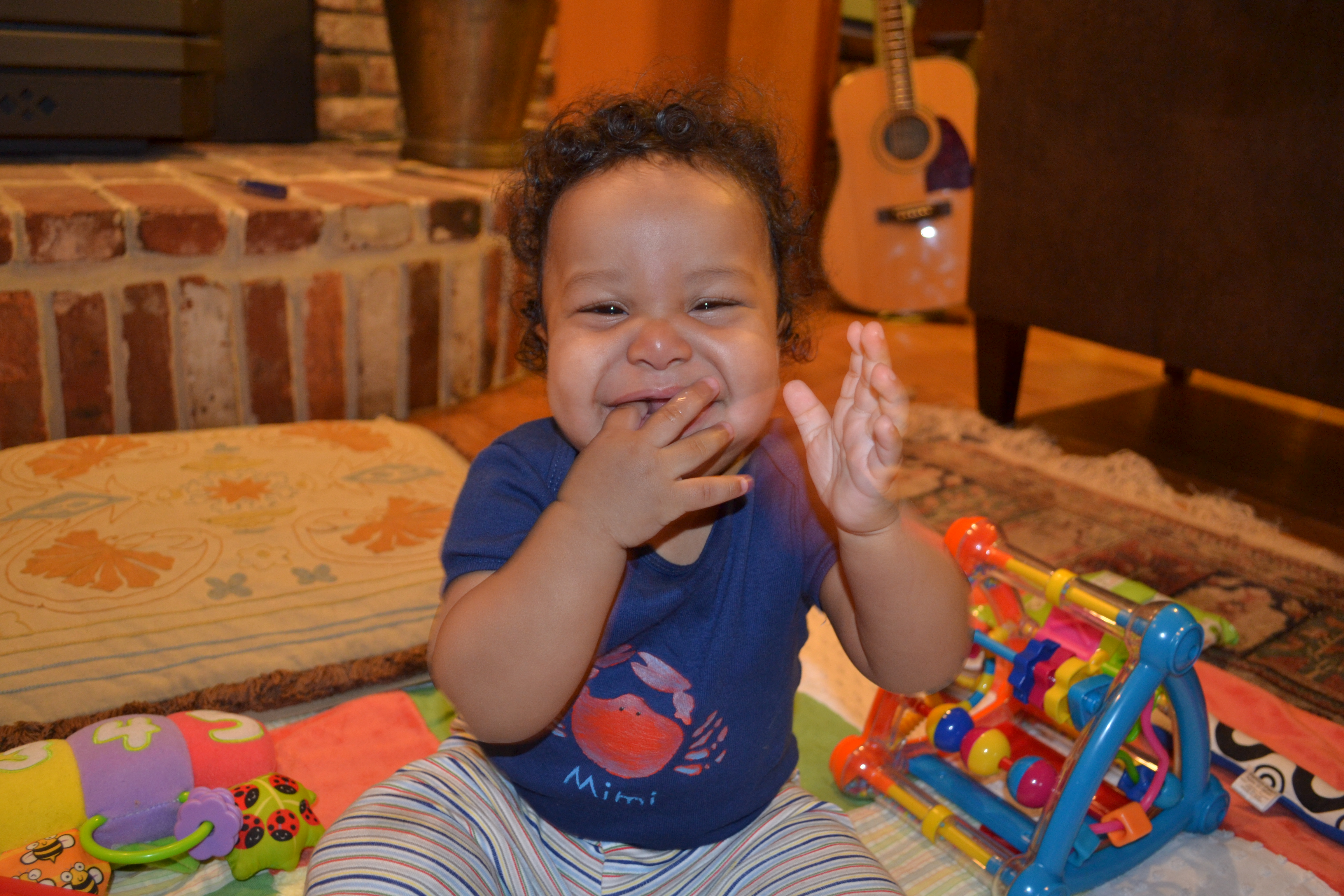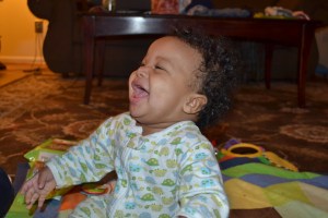His other favorite things are my cell phone, any kind of remote, Daddy’s glasses, and of course he still likes pulling hair…hard!  He’s started to make more funny expressions now, too.