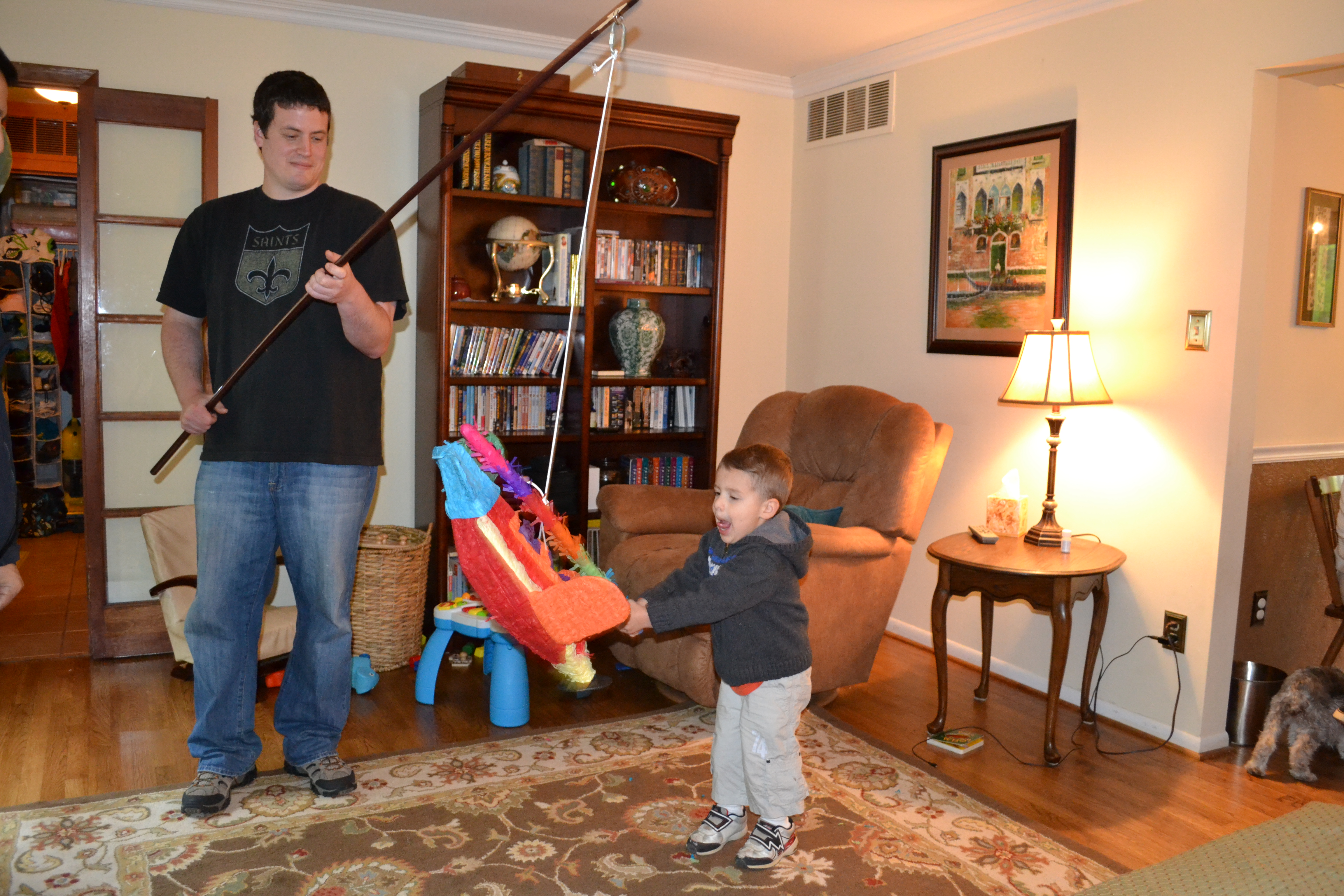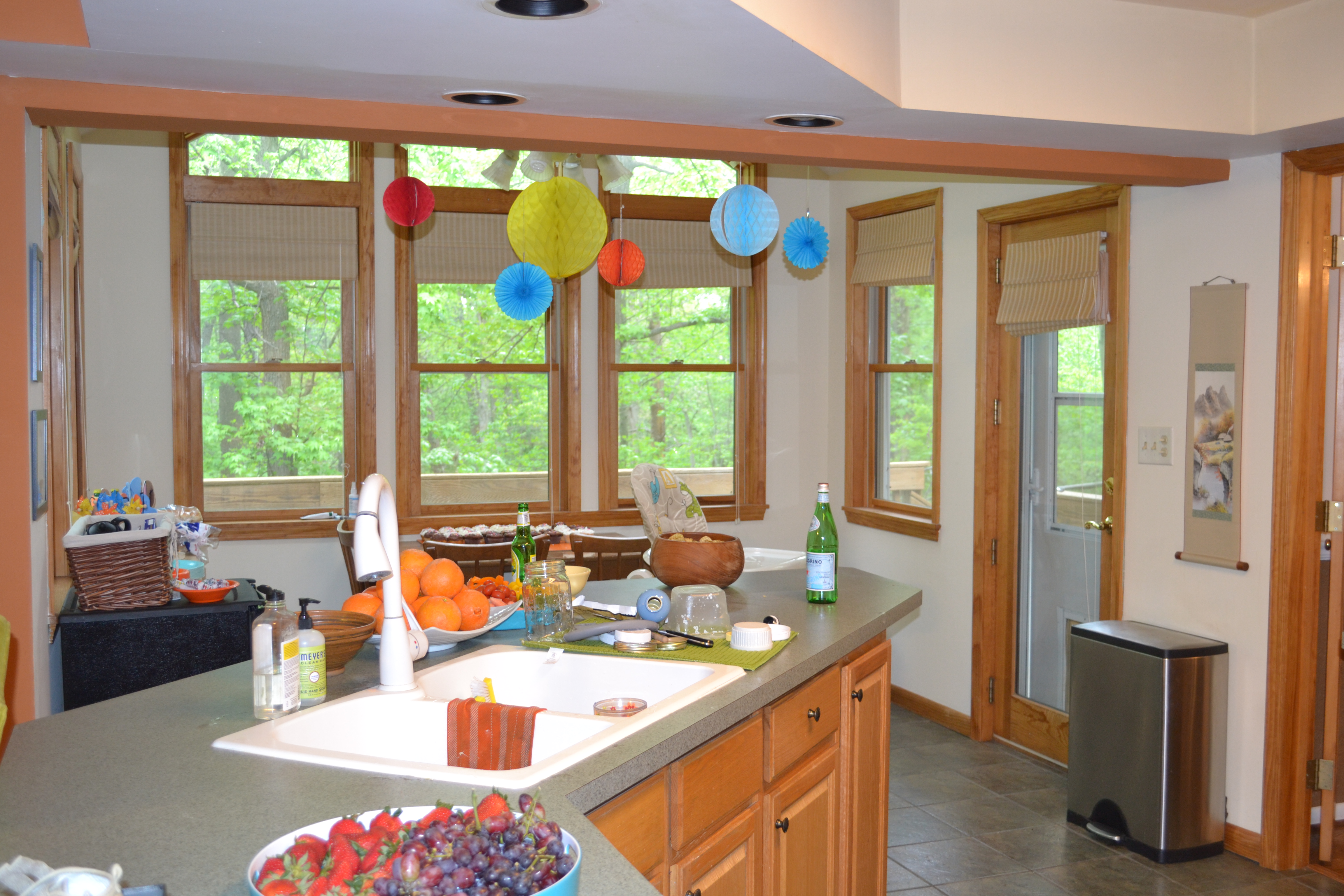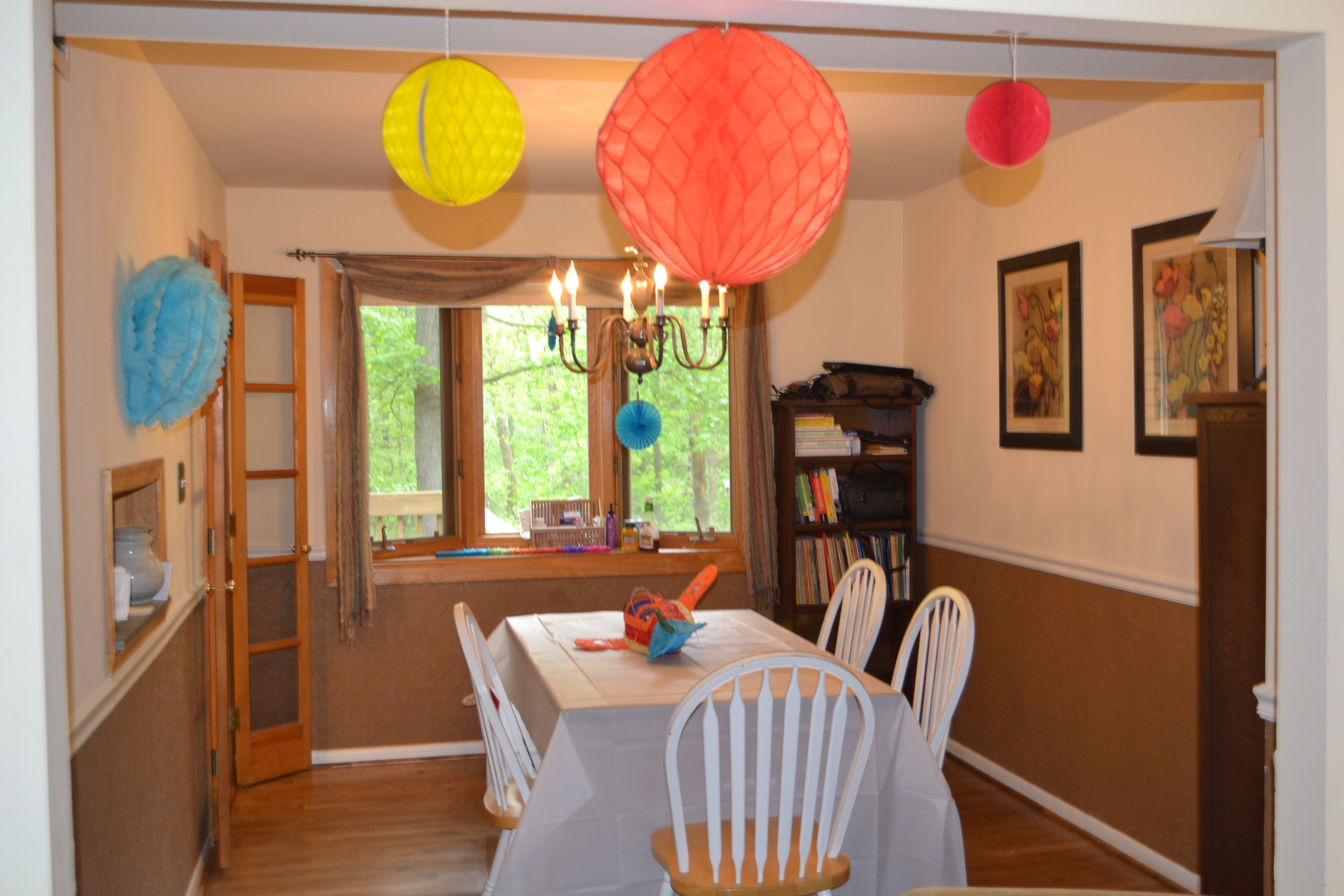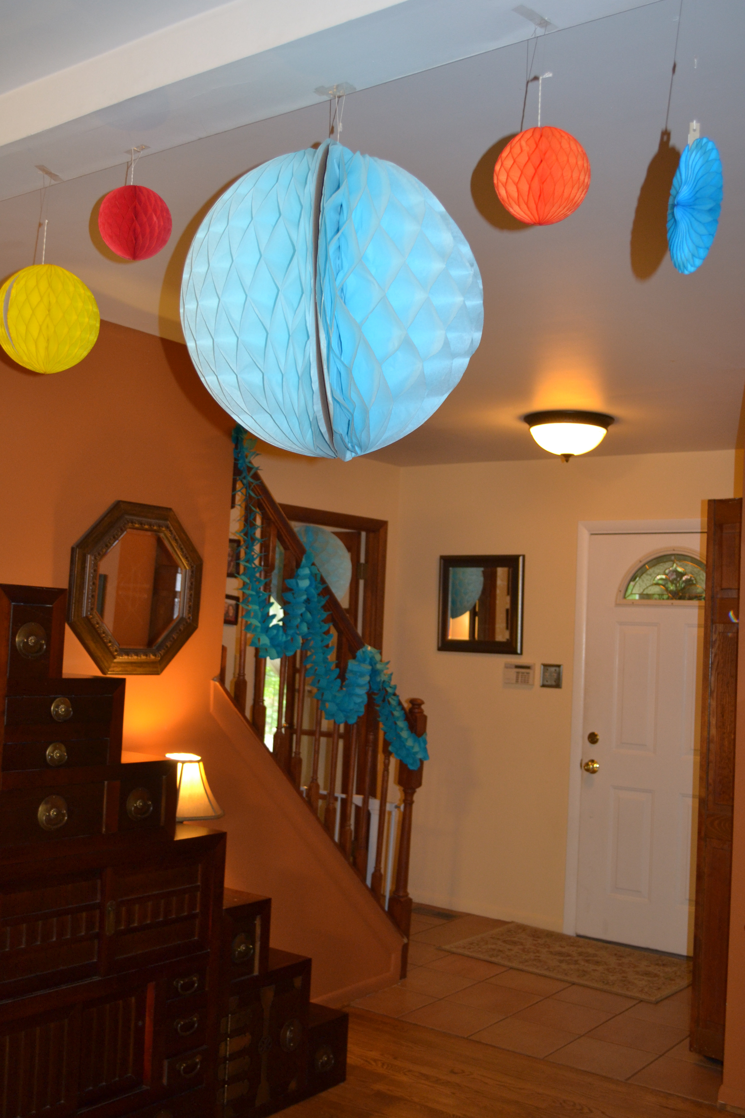 Isaac slept in on the day of his party, waking up at 9:15! As I brought him downstairs, he was rubbing sleep out of his eyes, then staring in amazement and wonder at all of the colorful decorations Mom and I had put up the night before. He pointed and ooh’ed and aah’ed with the biggest smile on his face at the giant honeycomb balls.