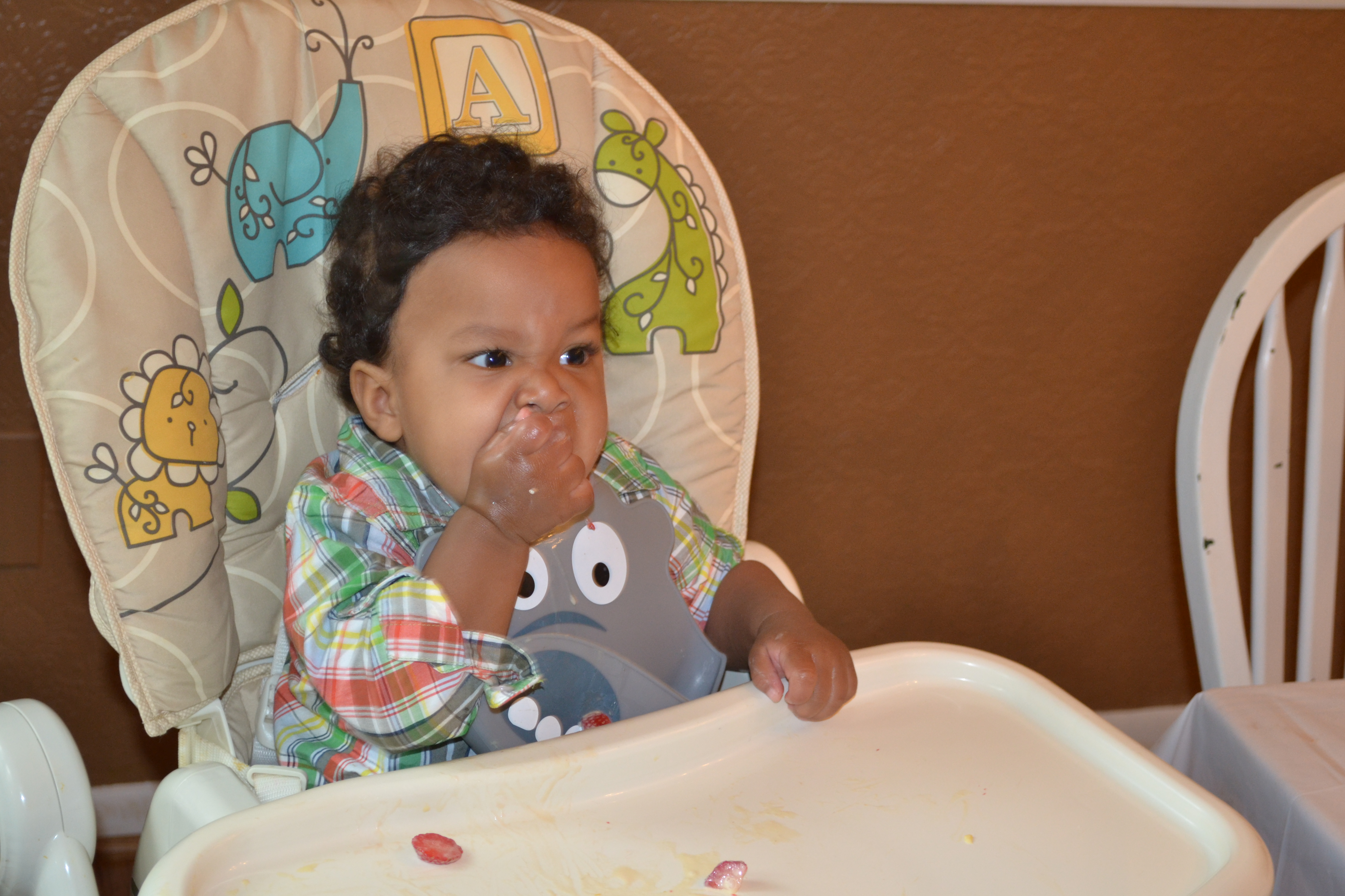 He had his very first taste of sugar (just a teeny taste, mind you), but his real dessert was his favorite – strawberries – with some tasty ice cream from the farm.
