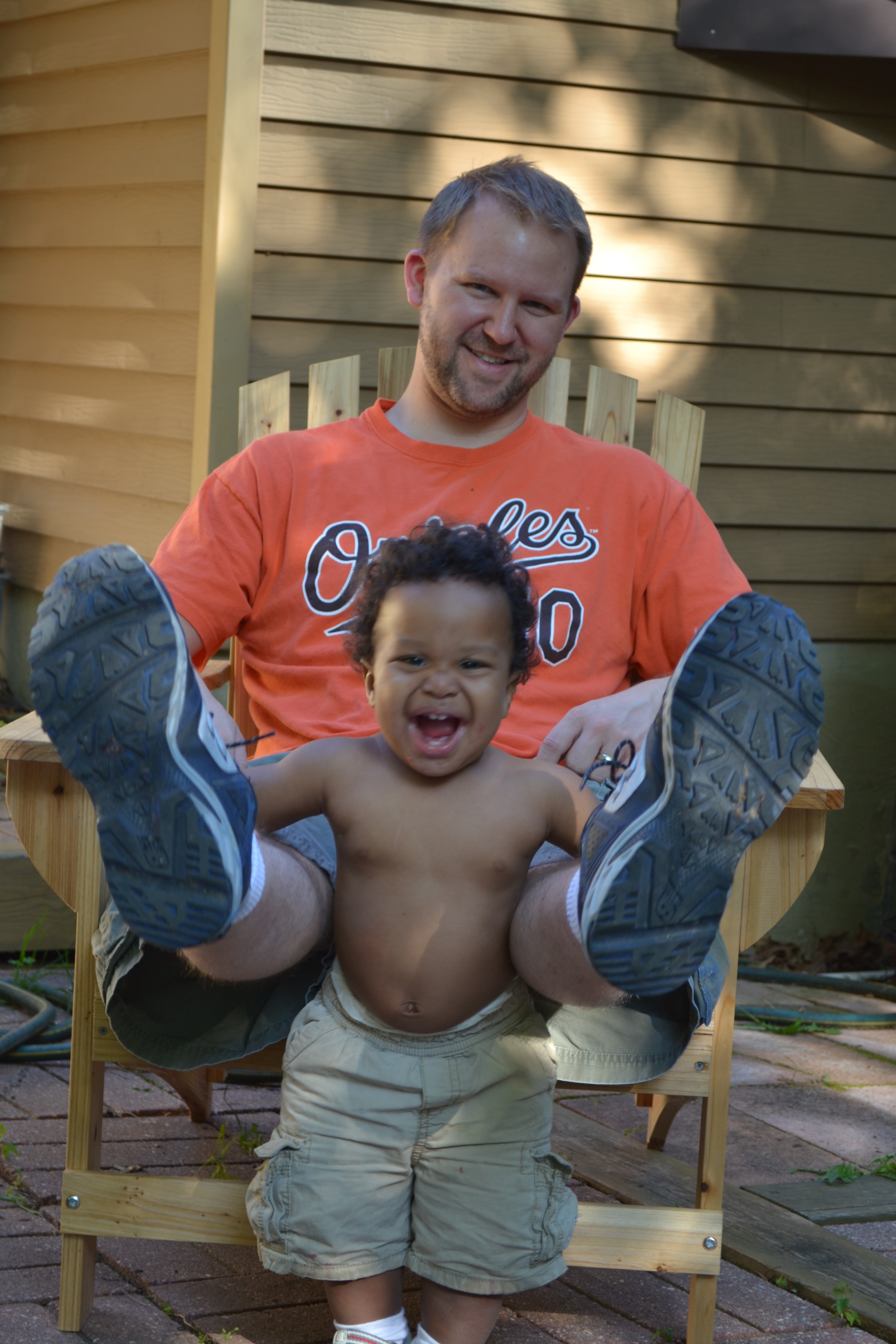 His favorite word of the moment is “tee-tat” (kitty cat).  Also high on the list is “woof” (anytime he sees a dog or hears barking).  And of course he knows “Mama” and “Dada”, but still doesn’t like to call us that much yet.  He said “ball” today,and he tries to repeat quite a few other words.  He babbles away, pointing at things and repeating sounds, and he’s really trying to tell us something.