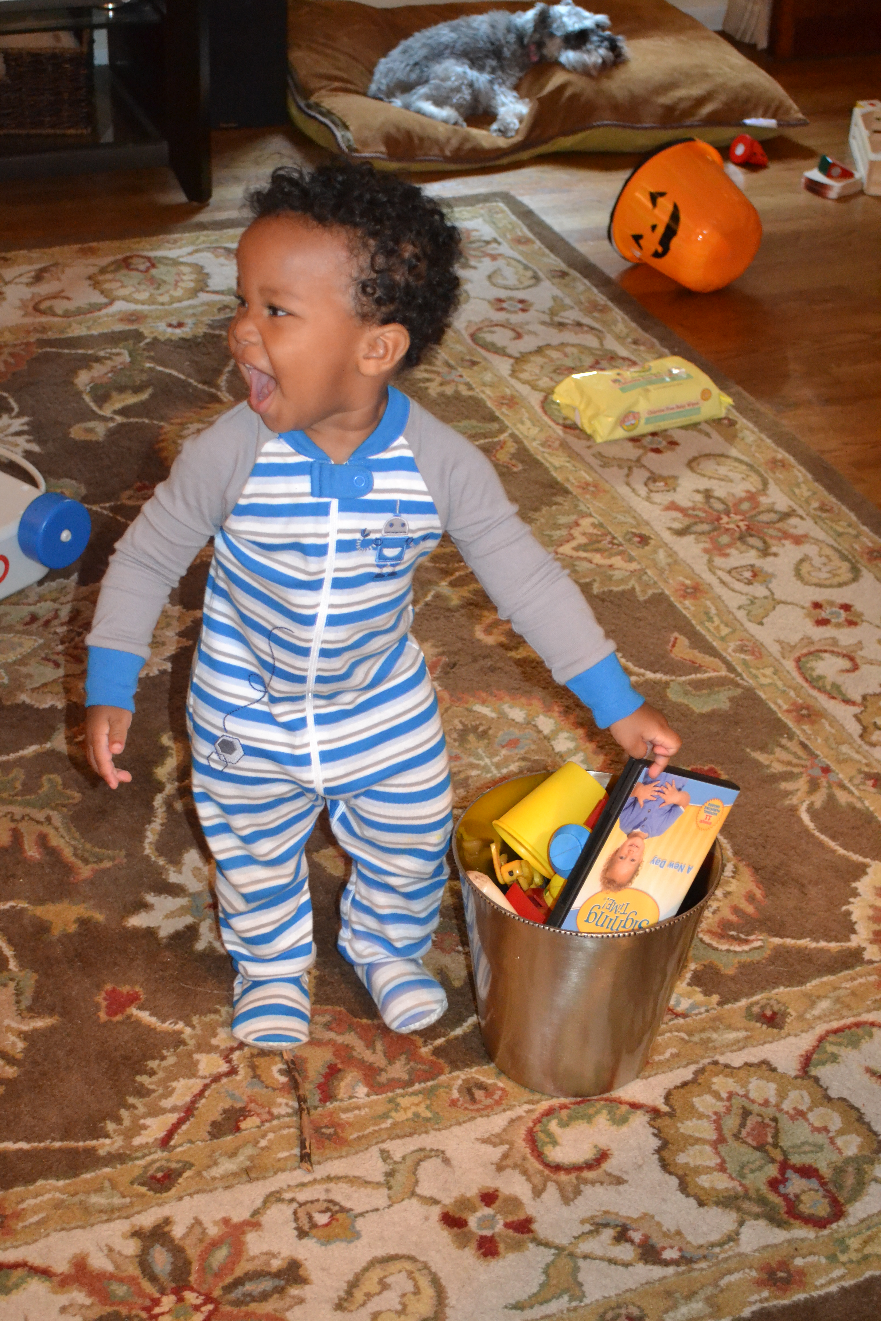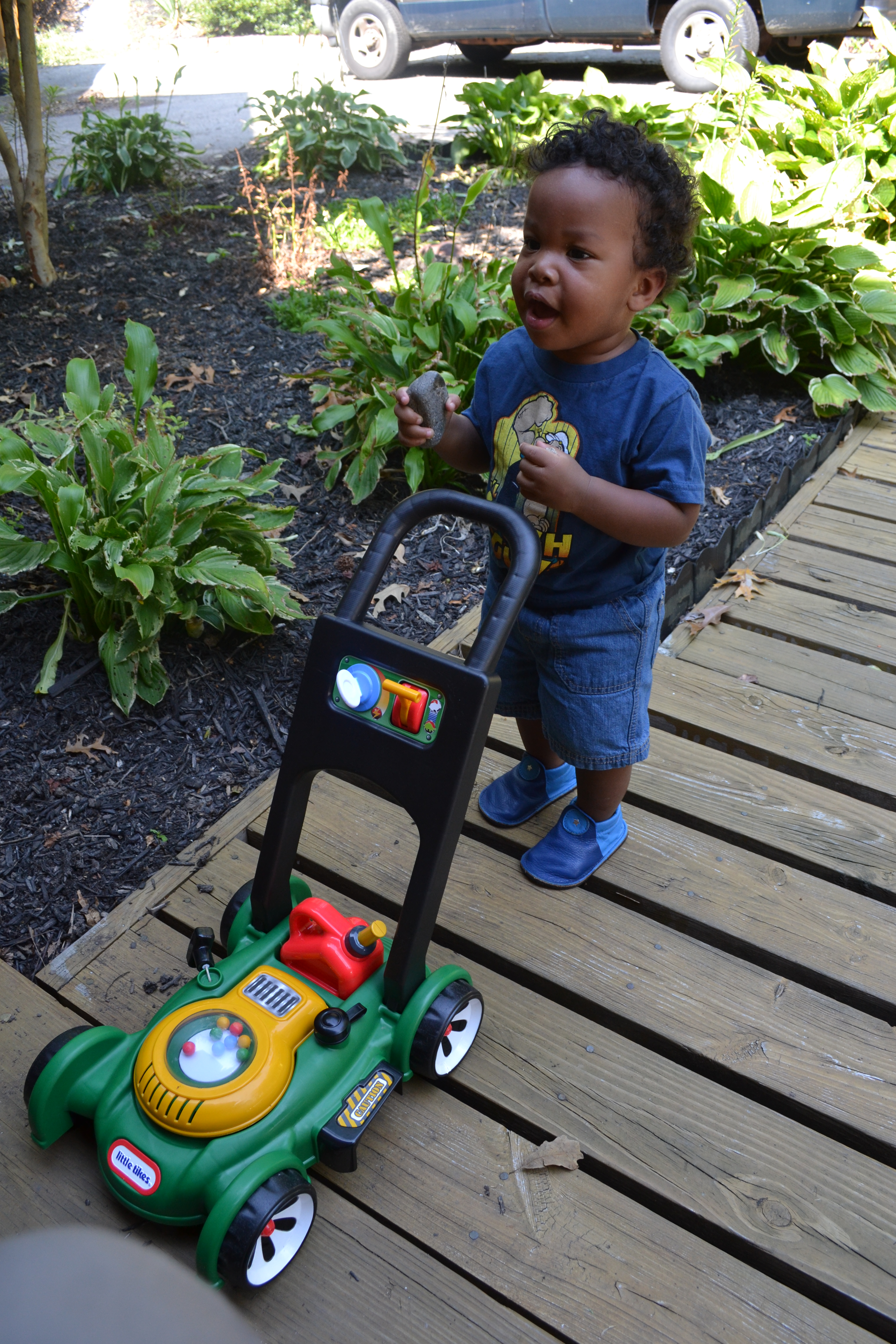 Playtime has gotten pretty serious these days.  My little man plays hard!  He runs all over the house, filling the wastebasket with books and carrying it around, or filling the dog bowls with puzzle pieces and carrying that around (see a pattern here?), or carrying his new pumpkin bucket around and picking up random objects to put in it.  He loves his new lawn mower from his aunt and pushes that all over the house and driveway, stopping to pull the little pull cord that makes engine sounds.  He loves rocks, oh boy does he.  He’ll fill his little fists with rocks of all sizes, and when his hands are full, he’ll pop a few in his mouth.  He picks up rocks on our walks around the neighborhood, and tries to bring handfuls into the house.  Luckily he hasn’t discovered his pockets yet – I’ll be in trouble when that happens!