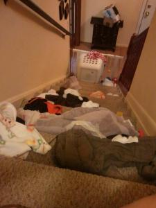 This past week, I was cleaning out my linen closet and he was upstairs with me, relatively unsupervised for a few minutes although he was just a few feet from me the whole time.  I looked around after just a few minutes and he was throwing everything he could find down the stairs – every couple of minutes he’d run into his room and come back out with something else to toss.  His trashcan (complete with dirty diapers), towels I had stacked on the floor behind me, stuffed animals, articles of clothing, toys, all were chucked down the stairs in less than five minutes.